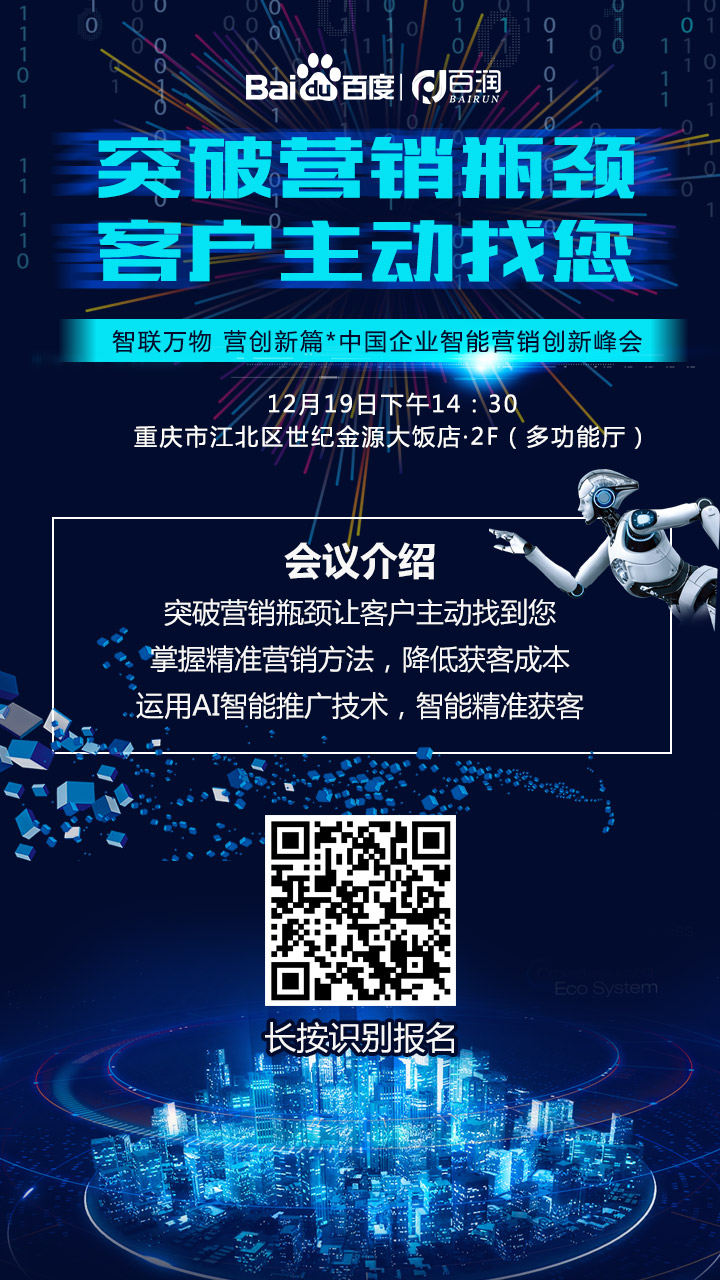 2018年12月19日,下午14:30,智聯(lián)萬(wàn)物 營(yíng)創(chuàng)新篇-中國(guó)企業(yè)智能營(yíng)銷創(chuàng)新峰會(huì),在重慶市江北區(qū)世紀(jì)金源大飯店·2F(多功能廳)隆重舉行,誠(chéng)摯邀請(qǐng)您的參與。本次峰會(huì)將為各大企業(yè)及精英共同探討: