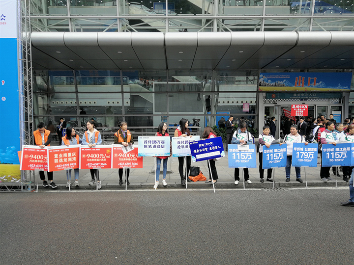 一出輕軌站,小編立馬就感受到了房交會(huì)的“狂熱”氛圍,幾乎全重慶發(fā)傳單的大媽都聚到了這里,隨處可見(jiàn)舉著廣告牌的兼職小哥和身穿西裝戴著工牌的銷(xiāo)售人員,不管你看起來(lái)是個(gè)身懷巨款的土豪還是像小編這樣的“三無(wú)青年”,在這里每走一步,都會(huì)有人熱情地湊上來(lái)用親切的口吻詢問(wèn)你:“帥哥,看房嗎?”