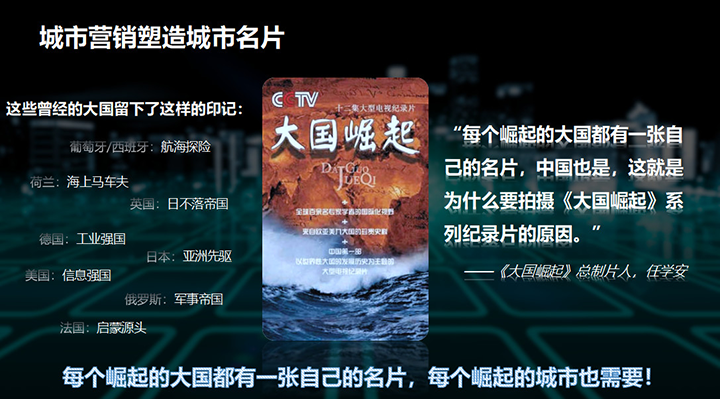 《大國(guó)崛起》的任學(xué)安說(shuō)“每一個(gè)崛起的大國(guó)都有一張城市名片,中國(guó)也是,這就是為什么要拍攝《大國(guó)崛起》系列紀(jì)錄片的原因”。